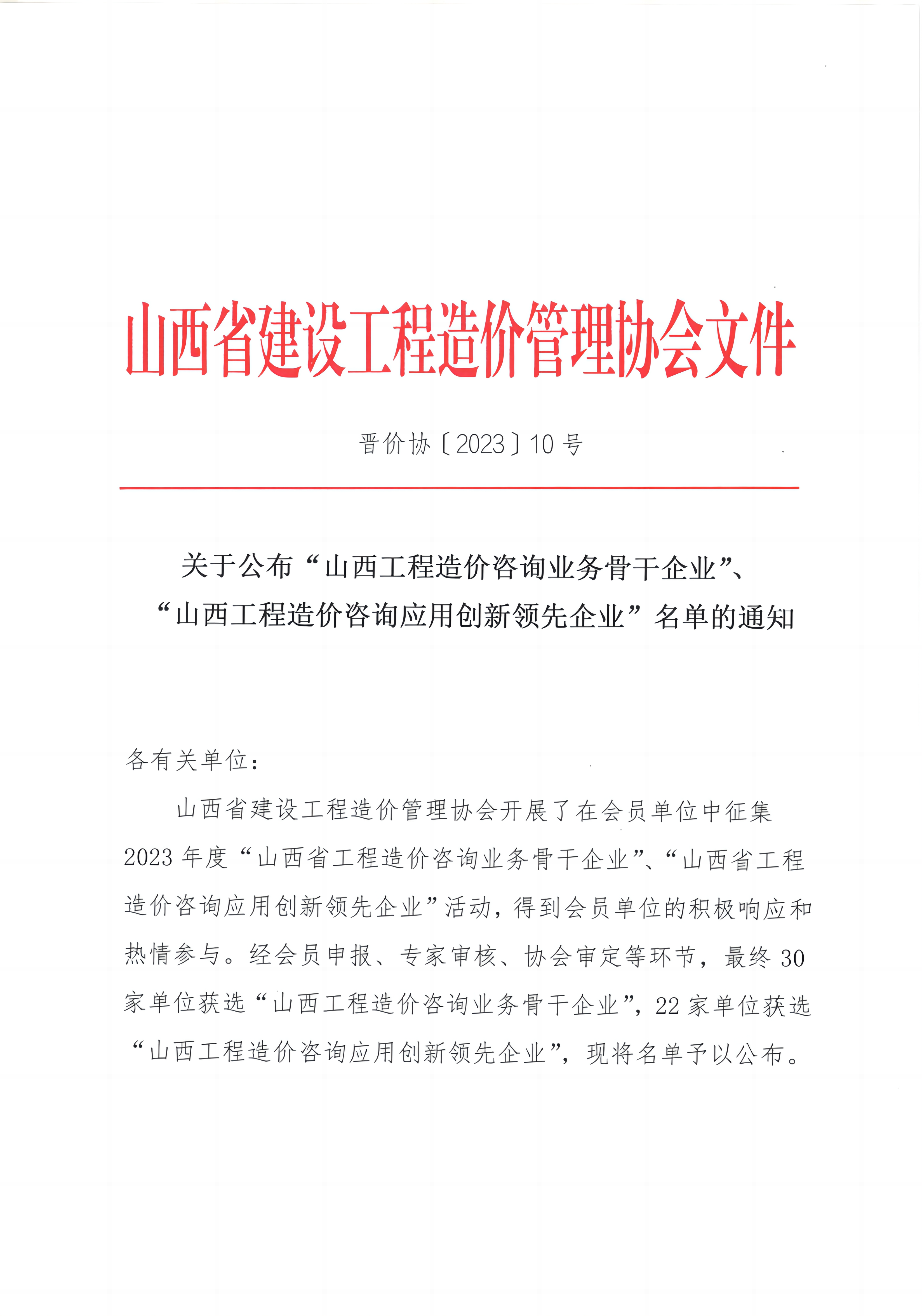2023年,省價(jià)協(xié)開展2023年度“山西省工程造價(jià)咨詢業(yè)務(wù)骨干企業(yè)”、“山西省工程造價(jià)咨詢應(yīng)用創(chuàng)新領(lǐng)先企業(yè)"活動(dòng),我公司積極參與申報(bào),經(jīng)省價(jià)協(xié)初審、專家評(píng)審,最終,我公司入選2023年度“山西省工程造價(jià)咨詢業(yè)務(wù)骨干企業(yè)”。